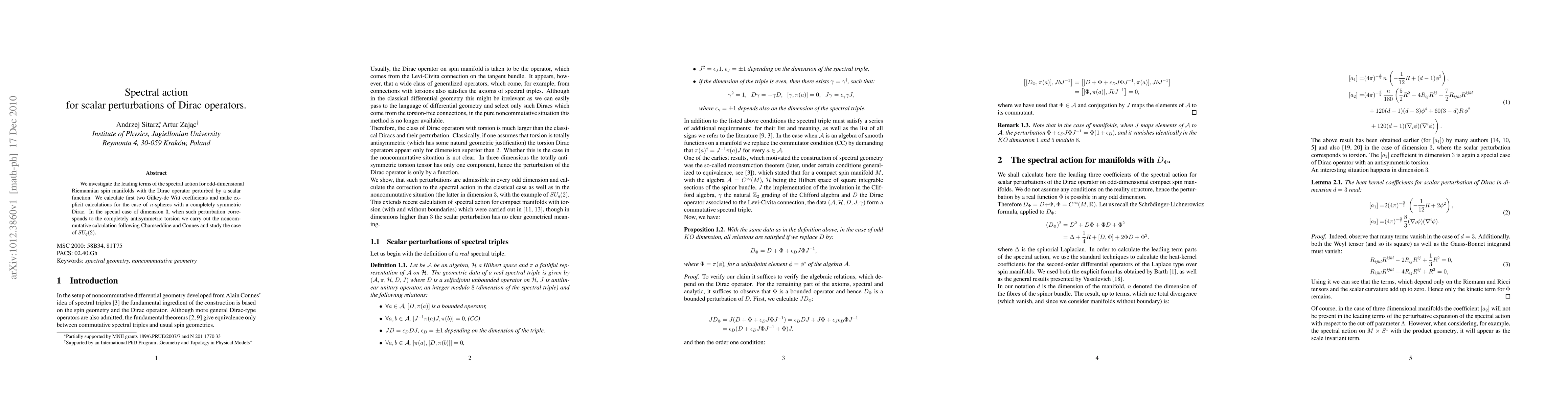 We investigate the leading terms of the spectral action for odd-dimensional Riemannian spin manifolds with the Dirac operator perturbed by a scalar function. We calculate first two Gilkey-de Witt coefficients and make explicit calculations for the case of $n$-spheres with a completely symmetric Dirac. In the special case of dimension 3, when such perturbation corresponds to the completely antisymmetric torsion we carry out the noncommutative calculation following Chamseddine and Connes and study the case of $SU_q(2)$.
