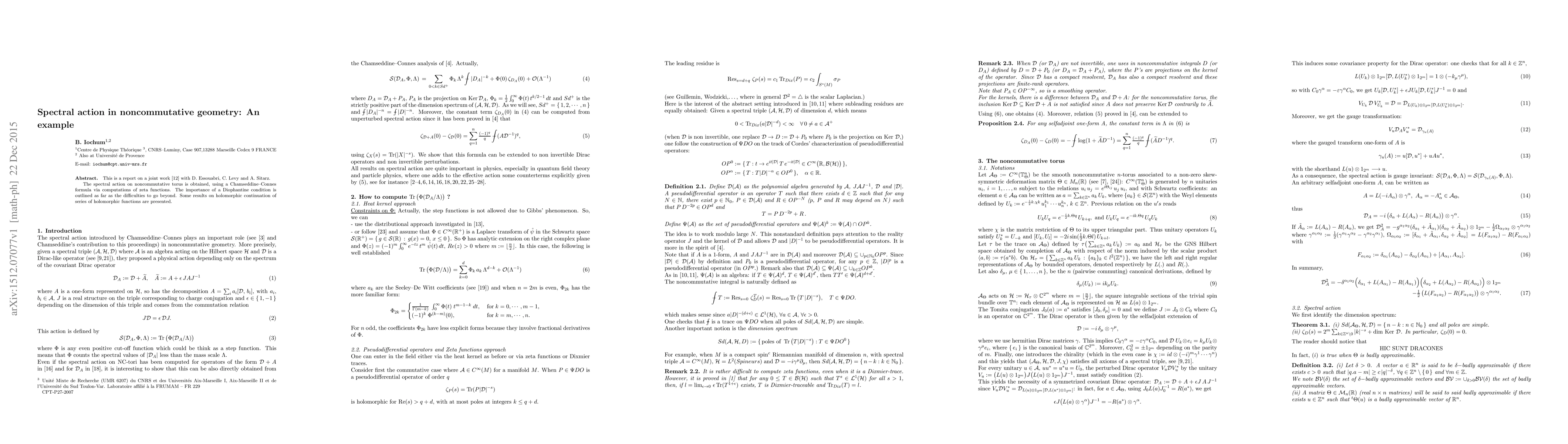 Researchers used a formula to calculate the spectral action on the noncommutative torus, exploring its applications in physics and highlighting challenges in extending the results. They also made progress on holomorphic continuation of series of functions.