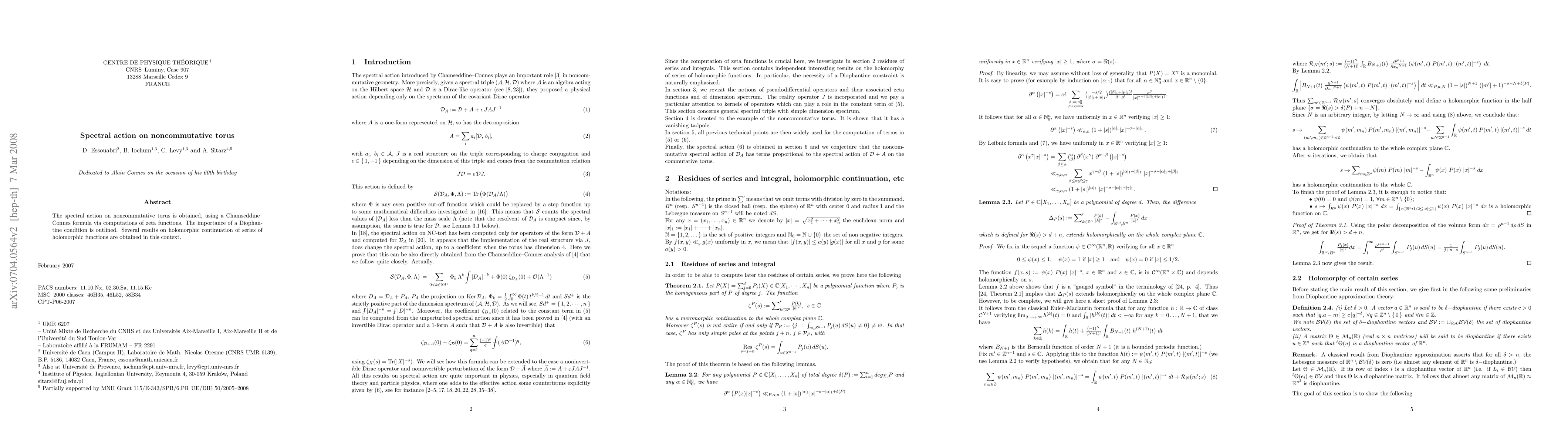 This paper derives the spectral action on a noncommutative torus through the Chamseddine-Connes formula, utilizing zeta function computations. It highlights the significance of a Diophantine condition and presents results on the holomorphic continuation of series of holomorphic functions.