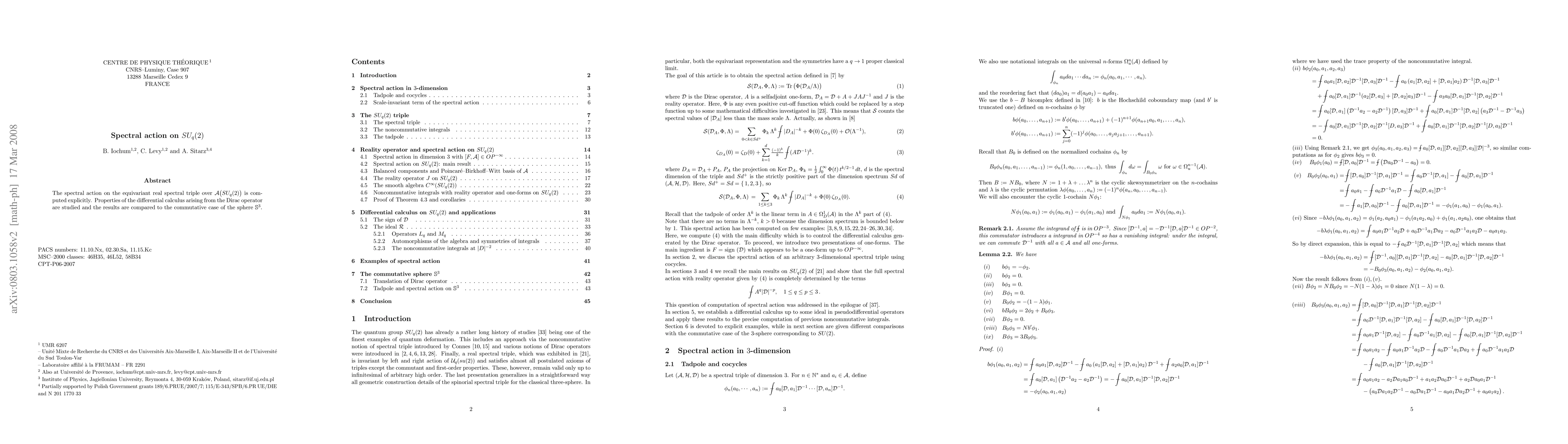 The paper computes the spectral action for the equivariant real spectral triple over \A(SU_q(2)) and examines properties of the differential calculus from the Dirac operator, comparing its results to the commutative case of the sphere S^3.