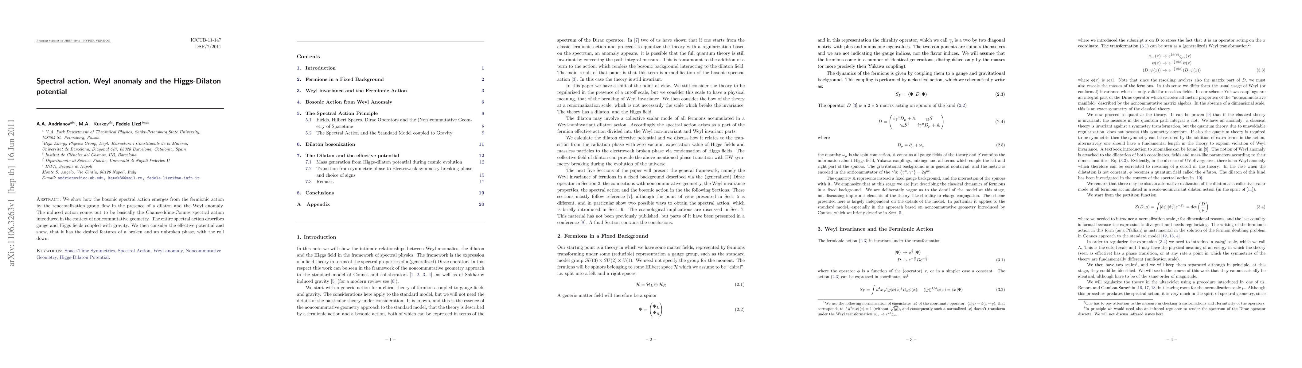 The study demonstrates how a bosonic spectral action emerges from a fermionic action via renormalization group flow in the presence of a dilaton and Weyl anomaly, matching the Chamseddine-Connes spectral action.