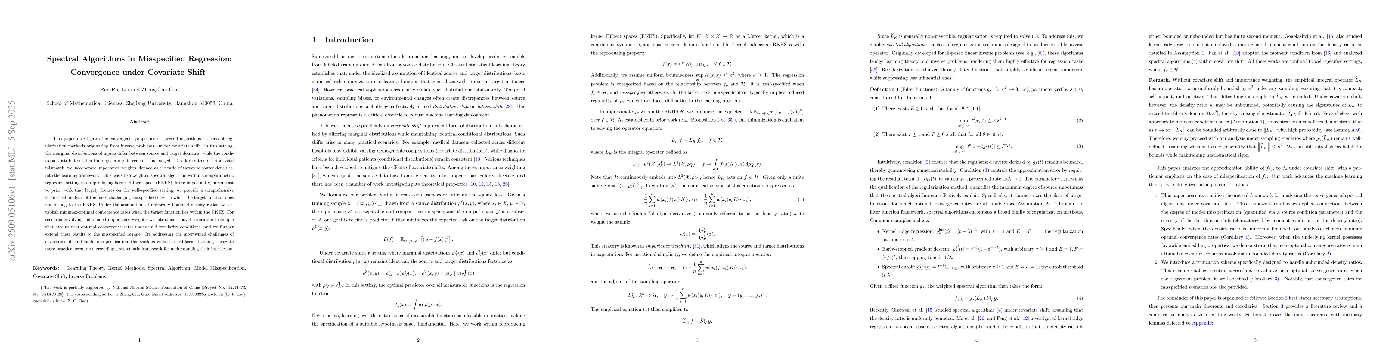 This paper investigates the convergence properties of spectral algorithms -- a class of regularization methods originating from inverse problems -- under covariate shift. In this setting, the marginal distributions of inputs differ between source and target domains, while the conditional distribution of outputs given inputs remains unchanged. To address this distributional mismatch, we incorporate importance weights, defined as the ratio of target to source densities, into the learning framework. This leads to a weighted spectral algorithm within a nonparametric regression setting in a reproducing kernel Hilbert space (RKHS). More importantly, in contrast to prior work that largely focuses on the well-specified setting, we provide a comprehensive theoretical analysis of the more challenging misspecified case, in which the target function does not belong to the RKHS. Under the assumption of uniformly bounded density ratios, we establish minimax-optimal convergence rates when the target function lies within the RKHS. For scenarios involving unbounded importance weights, we introduce a novel truncation technique that attains near-optimal convergence rates under mild regularity conditions, and we further extend these results to the misspecified regime. By addressing the intertwined challenges of covariate shift and model misspecification, this work extends classical kernel learning theory to more practical scenarios, providing a systematic framework for understanding their interaction.
