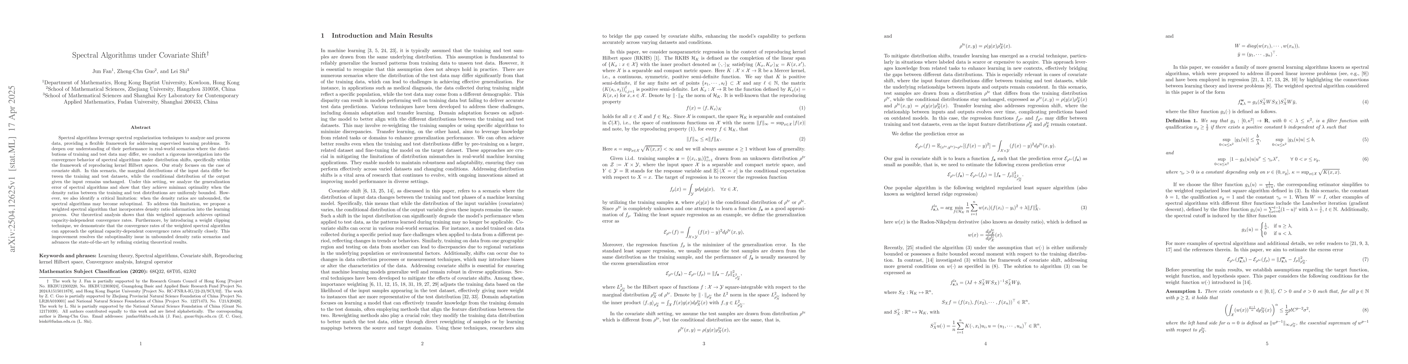 The paper investigates spectral algorithms under covariate shift, analyzing their convergence behavior in the context of reproducing kernel Hilbert spaces (RKHS). It focuses on the case of covariate shift where marginal input distributions differ between training and test datasets, while the conditional output distribution remains unchanged.