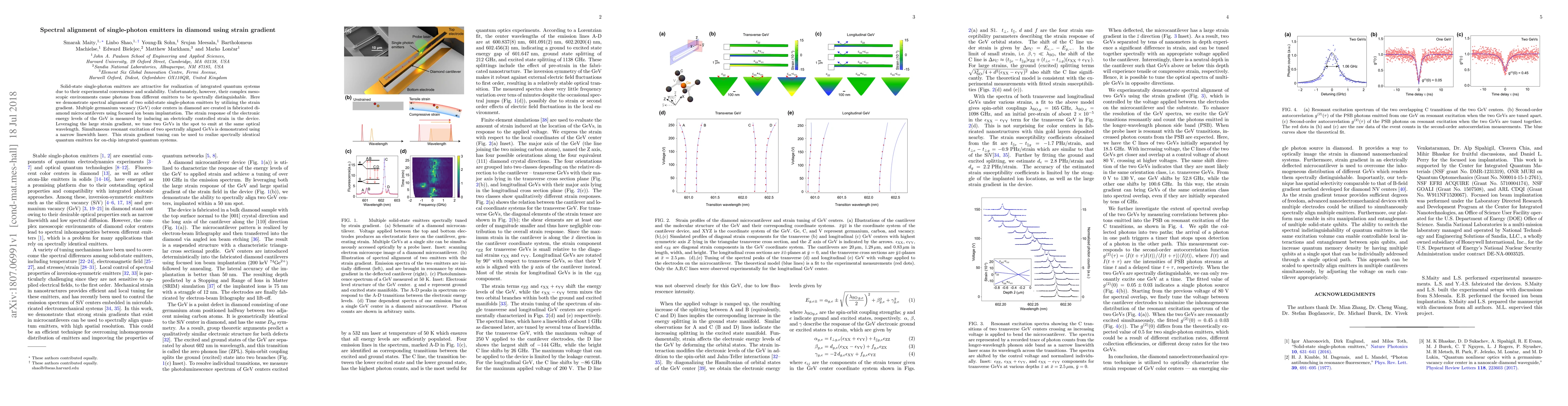 This research demonstrates spectral alignment of two solid-state single-photon emitters in diamond using a strain gradient. By creating germanium vacancy color centers in diamond microcantilevers and inducing electrically controlled strain, the electronic energy levels are tuned, allowing emission at the same optical wavelength for potential use in integrated quantum systems.