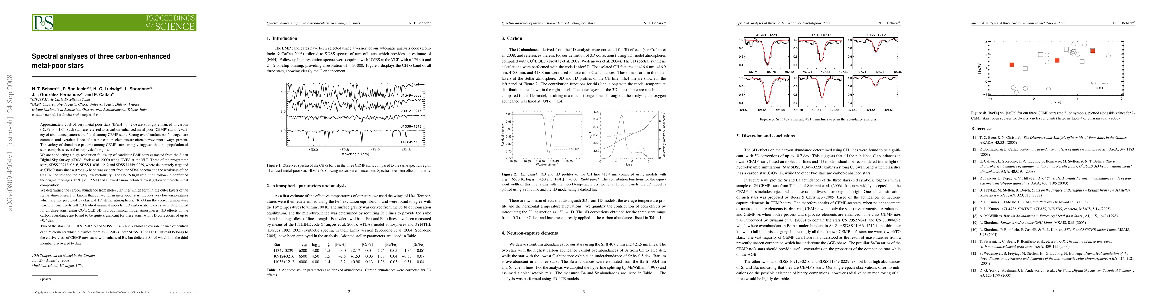 This paper conducts high-resolution spectral analyses of three carbon-enhanced metal-poor stars (CEMP) using UVES at the VLT, confirming their low metallicity and detailed chemical compositions. 3D hydrodynamical models reveal significant corrections to carbon abundances, with two stars classified as CEMP-s and one as CEMP-no/s.