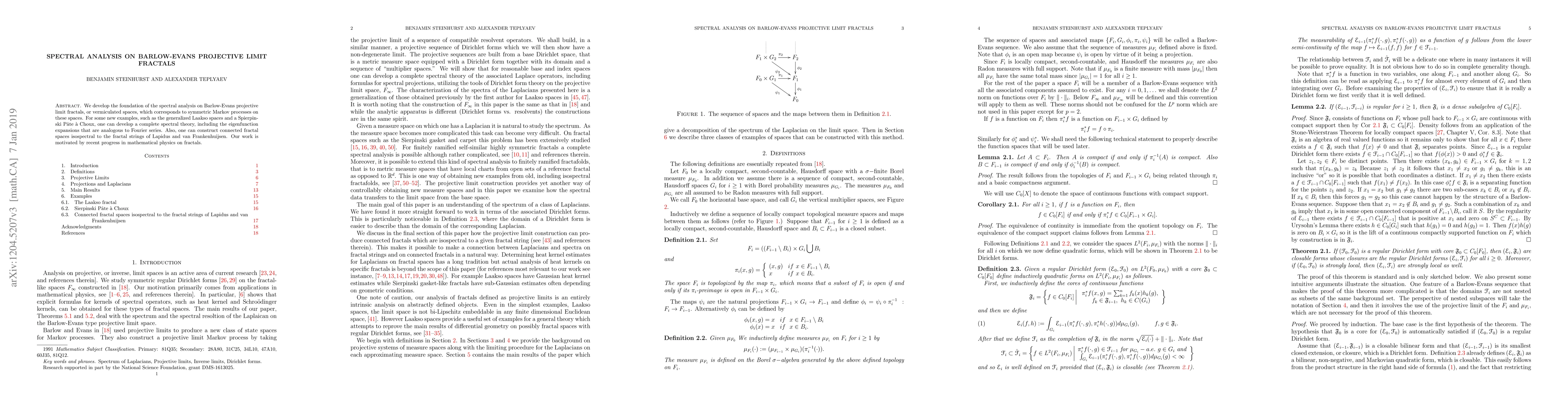 We develop the foundation of the spectral analysis on Barlow-Evans projective limit fractals, or vermiculated spaces, which corresponds to symmetric Markov processes on these spaces. For some new examples, such as the generalized Laakso spaces and a Spierpinski P\^ate \`a Choux, one can develop a complete spectral theory, including the eigenfunction expansions that are analogous to Fourier series. Also, one can construct connected fractal spaces isospectral to the fractal strings of Lapidus and van Frankenhuijsen. Our work is motivated by recent progress in mathematical physics on fractals.