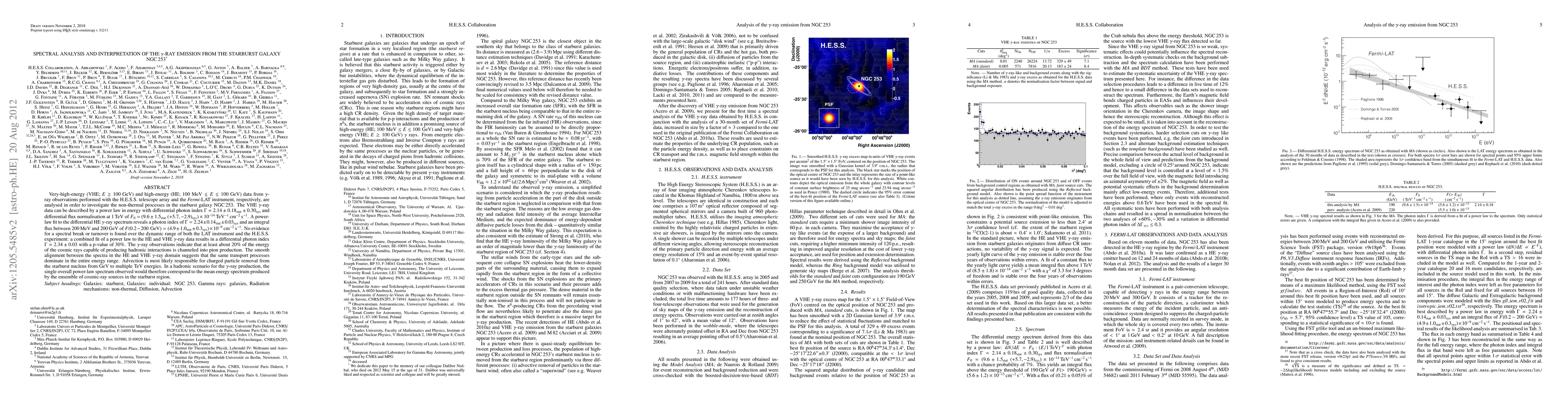 The research analyzes gamma-ray emissions from starburst galaxy NGC 253 using data from H.E.S.S. and Fermi-LAT instruments. It finds a consistent power-law spectrum from 100 MeV to 100 TeV, indicating that advection likely removes cosmic rays from the starburst nucleus across GeV to TeV energies. This suggests a single, dominant transport process for charged particles in the starburst region, and about 20% of cosmic ray energy contributes to pion production.