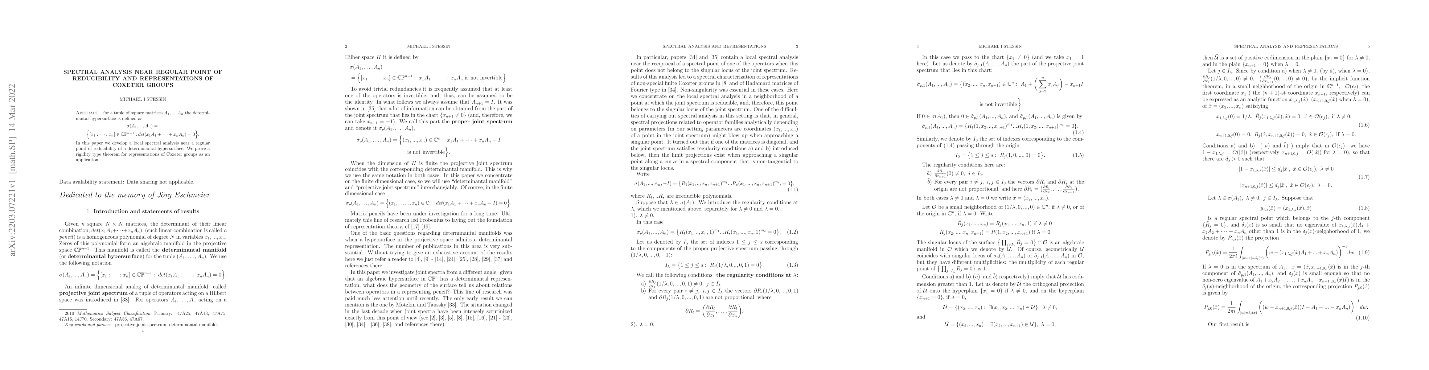 This paper develops local spectral analysis near a regular point of reducibility of a determinantal hypersurface defined by a tuple of matrices. It proves a rigidity type theorem for representations of Coxeter groups as an application.