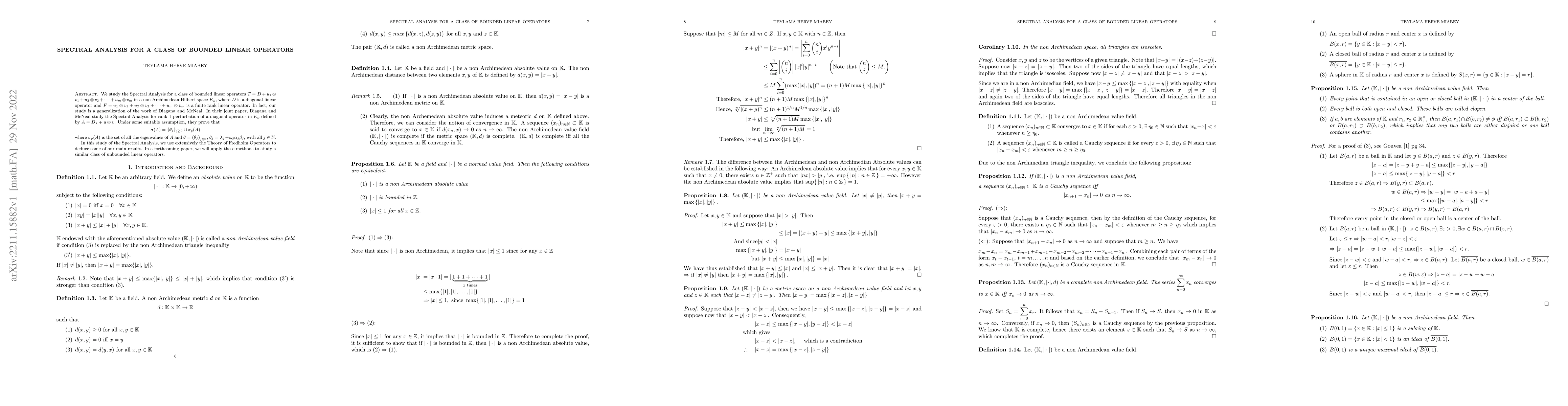 We study the Spectral Analysis for a class of bounded linear operators T = D + F in a non Archimedean Hilbert space E, where D is a diagonal linear operator and where F is a finite rank linear operator. In this study of the Spectral Analysis, we use extensively the Theory of Fredholm Operators to deduce some of our main results.