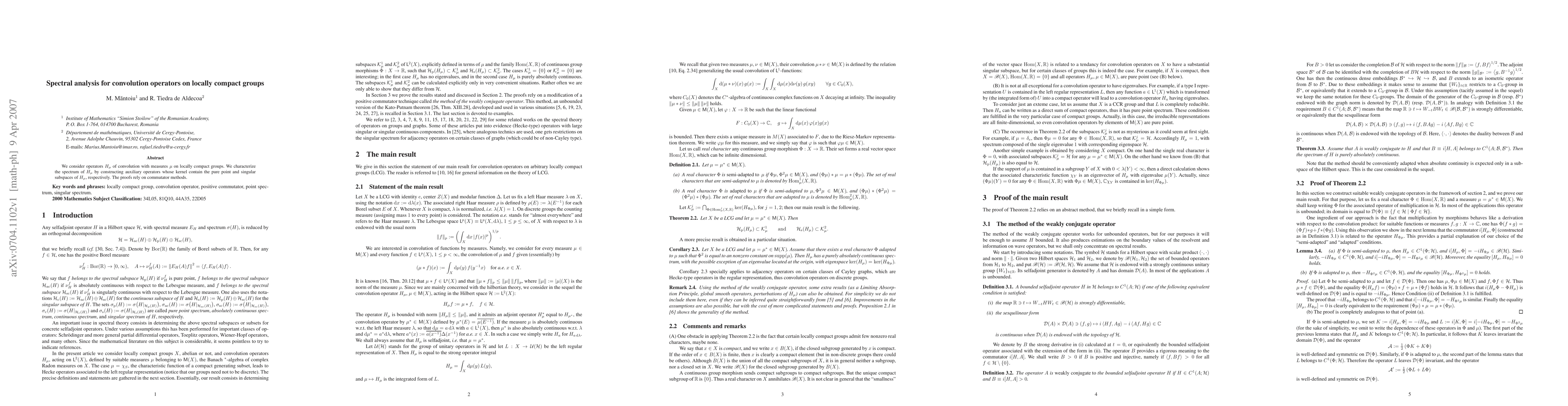 This paper characterizes the spectrum of convolution operators $H_\mu$ on locally compact groups by constructing auxiliary operators that isolate pure point and singular subspaces. The proofs utilize commutator methods to achieve the spectral analysis.