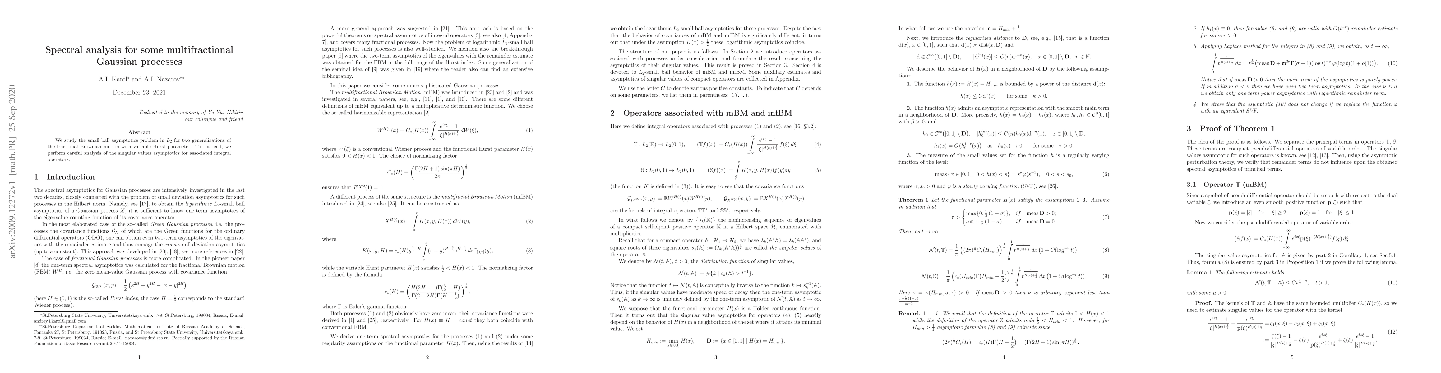 We study the small ball asymptotics problem in $L_2$ for two generalizations of the fractional Brownian motion with variable Hurst parameter. To this end, we perform careful analysis of the singular values asymptotics for associated integral operators.