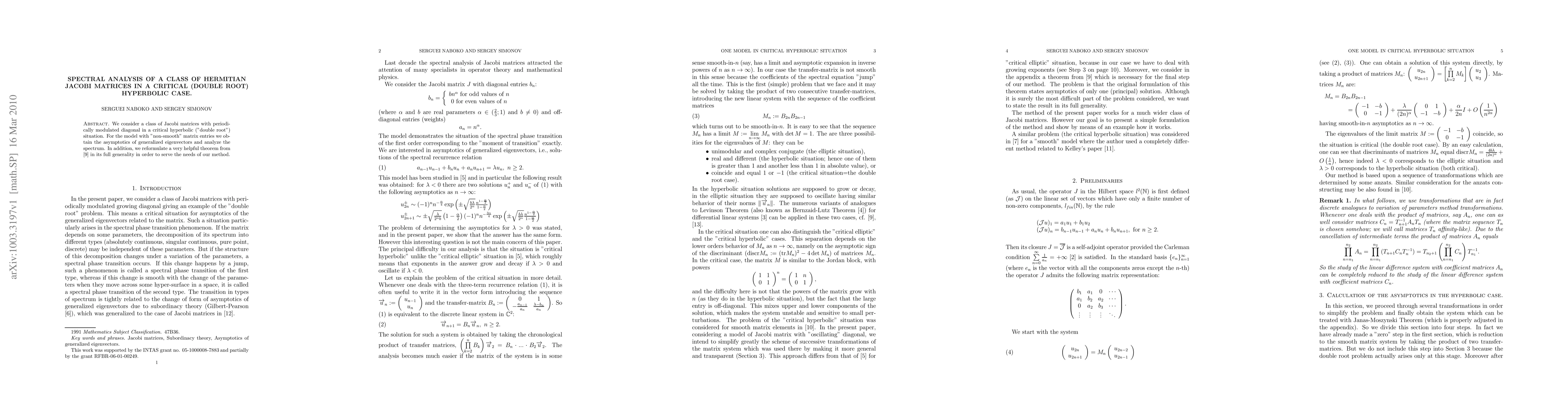 This research analyzes a specific class of Jacobi matrices with periodically varying diagonal entries in a critical hyperbolic scenario, deriving asymptotic behavior of generalized eigenvectors and spectrum. It also generalizes a theorem from Janas and Moszynski's work to support its methodology.