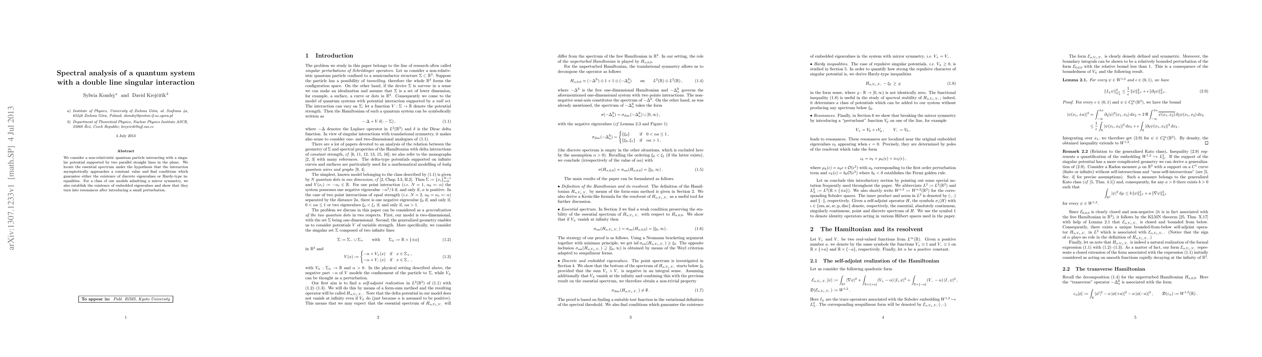Researchers studied a quantum system with a unique interaction between two parallel lines, finding conditions for discrete eigenvalues and resonances, and establishing the existence of embedded eigenvalues.