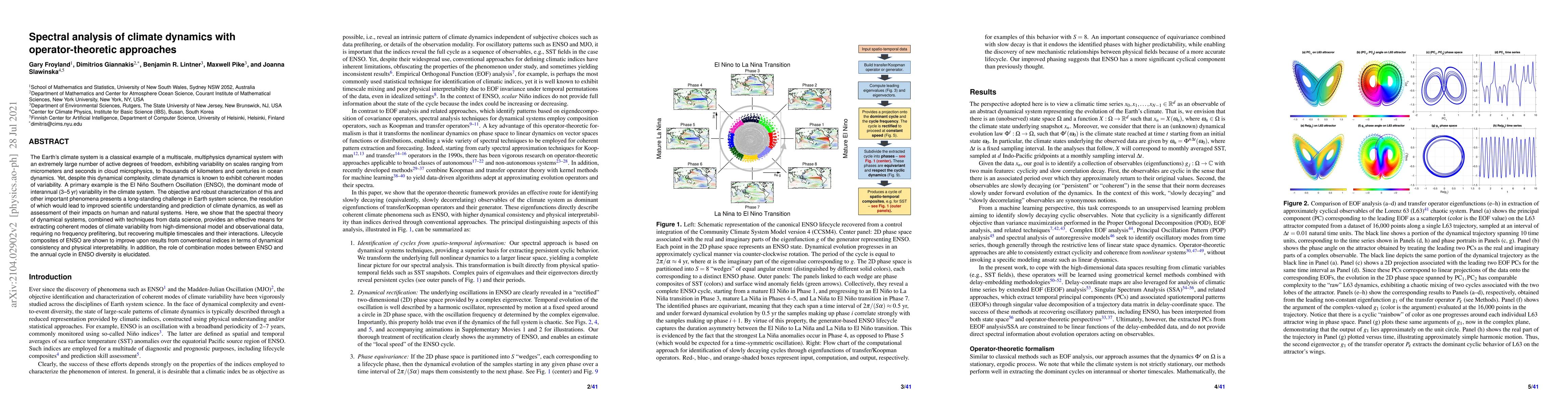 This paper utilizes spectral theory and operator-theoretic approaches to analyze climate dynamics, extracting coherent modes of variability from high-dimensional data without frequency prefiltering. It demonstrates improved characterization of phenomena like ENSO, highlighting the interactions between ENSO and the annual cycle, and enhancing the dynamical consistency and interpretability of lifecycle composites.