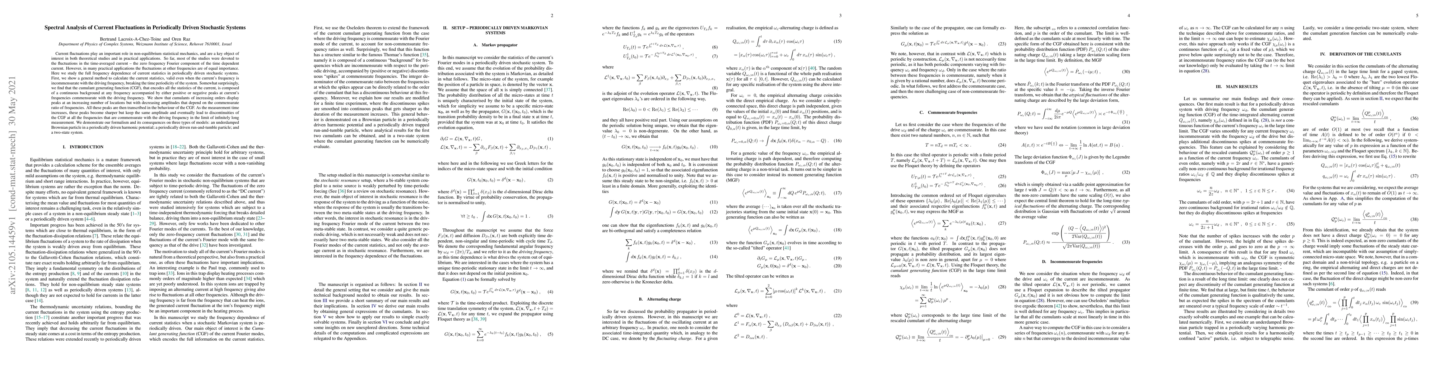 This paper develops a method to analyze the full frequency dependence of current fluctuations in periodically driven stochastic systems, revealing that cumulant generating functions exhibit peaks at frequencies commensurate with the driving frequency. The study demonstrates this formalism through three specific models: an underdamped Brownian particle, a run-and-tumble particle, and a two-state system.