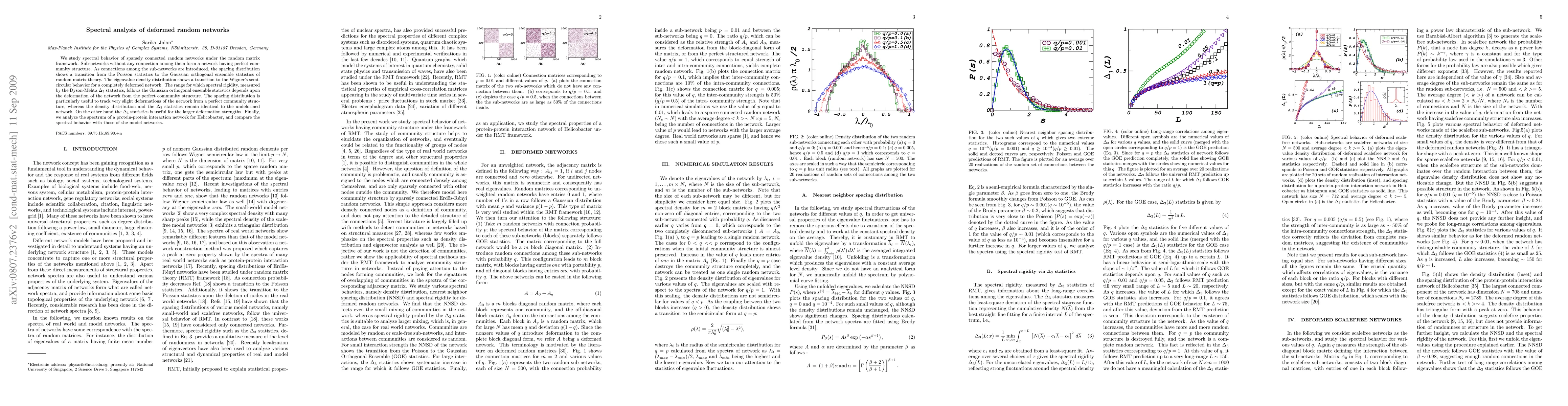 We study spectral behavior of sparsely connected random networks under the random matrix framework. Sub-networks without any connection among them form a network having perfect community structure. As connections among the sub-networks are introduced, the spacing distribution shows a transition from the Poisson statistics to the Gaussian orthogonal ensemble statistics of random matrix theory. The eigenvalue density distribution shows a transition to the Wigner's semicircular behavior for a completely deformed network. The range for which spectral rigidity, measured by the Dyson-Mehta $\Delta_3$ statistics, follows the Gaussian orthogonal ensemble statistics depends upon the deformation of the network from the perfect community structure. The spacing distribution is particularly useful to track very slight deformations of the network from a perfect community structure, whereas the density distribution and the $\Delta_3$ statistics remain identical to the undeformed network. On the other hand the $\Delta_3$ statistics is useful for the larger deformation strengths. Finally, we analyze the spectrum of a protein-protein interaction network for Helicobacter, and compare the spectral behavior with those of the model networks.