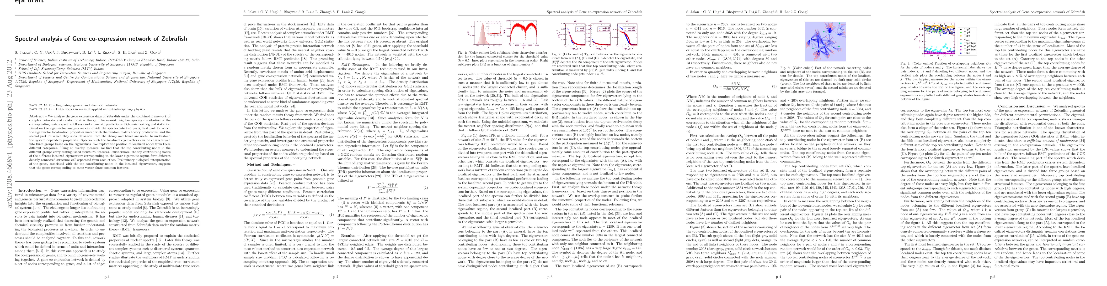 This research applies complex network and random matrix theory to analyze zebrafish gene co-expression networks, revealing two distinct parts in the spectra with different eigenvector localization properties. The study identifies three groups of localized eigenvectors and finds that top contributing nodes exhibit distinct structural features and densely connected structures.