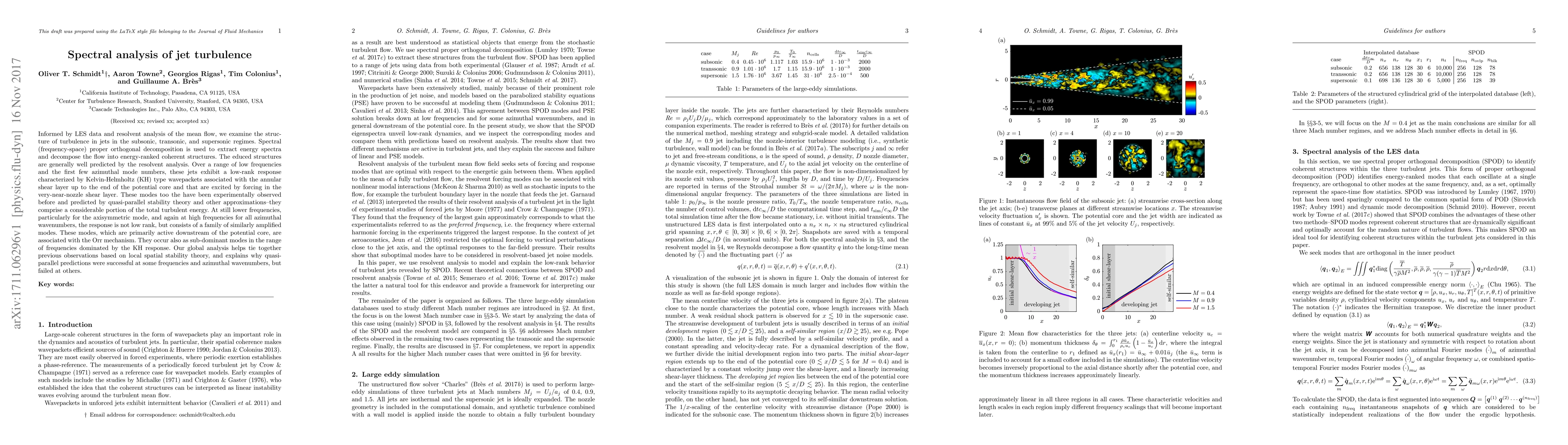Informed by LES data and resolvent analysis of the mean flow, we examine the structure of turbulence in jets in the subsonic, transonic, and supersonic regimes. Spectral (frequency-space) proper orthogonal decomposition is used to extract energy spectra and decompose the flow into energy-ranked coherent structures. The educed structures are generally well predicted by the resolvent analysis. Over a range of low frequencies and the first few azimuthal mode numbers, these jets exhibit a low-rank response characterized by Kelvin-Helmholtz (KH) type wavepackets associated with the annular shear layer up to the end of the potential core and that are excited by forcing in the very-near-nozzle shear layer. These modes too the have been experimentally observed before and predicted by quasi-parallel stability theory and other approximations--they comprise a considerable portion of the total turbulent energy. At still lower frequencies, particularly for the axisymmetric mode, and again at high frequencies for all azimuthal wavenumbers, the response is not low rank, but consists of a family of similarly amplified modes. These modes, which are primarily active downstream of the potential core, are associated with the Orr mechanism. They occur also as sub-dominant modes in the range of frequencies dominated by the KH response. Our global analysis helps tie together previous observations based on local spatial stability theory, and explains why quasi-parallel predictions were successful at some frequencies and azimuthal wavenumbers, but failed at others.