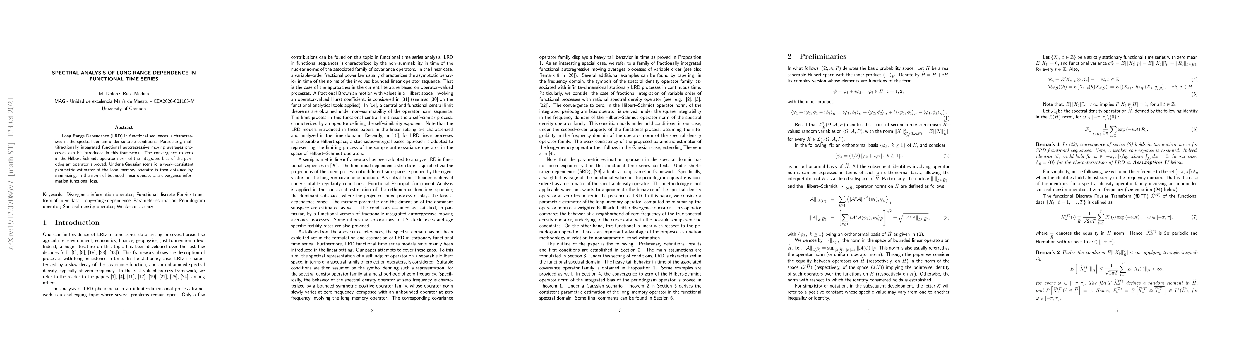 Long Range Dependence (LRD) in functional sequences is characterized in the spectral domain under suitable conditions. Particularly, multifractionally integrated functional autoregressive moving averages processes can be introduced in this framework. The convergence to zero in the Hilbert-Schmidt operator norm of the integrated bias of the periodogram operator is proved. Under a Gaussian scenario, a weak--consistent parametric estimator of the long--memory operator is then obtained by minimizing, in the norm of bounded linear operators, a divergence information functional loss.