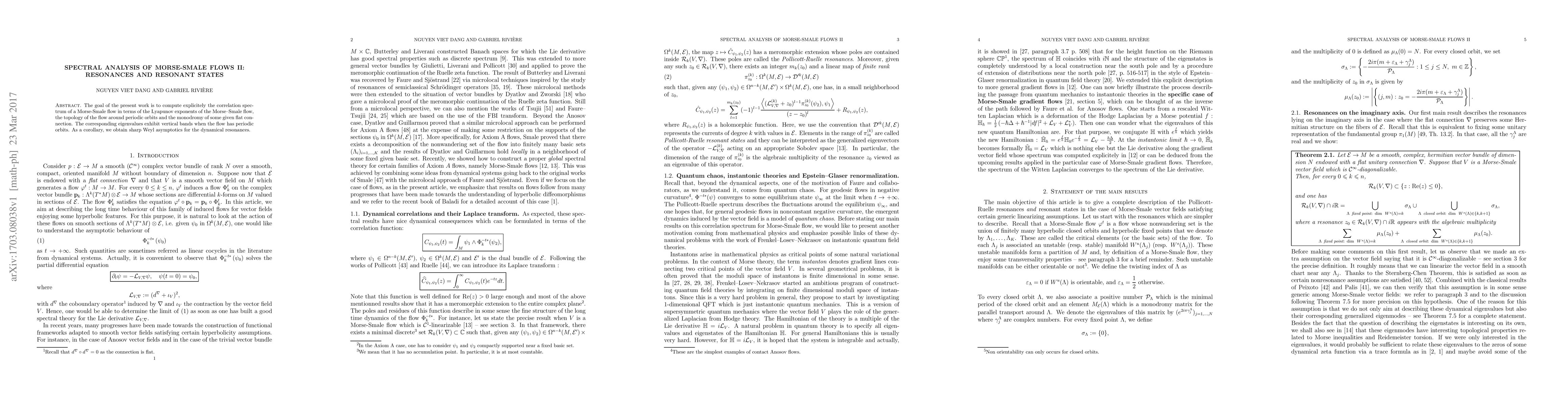The goal of the present work is to compute explicitely the correlation spectrum of a Morse-Smale flow in terms of the Lyapunov exponents of the Morse--Smale flow, the topology of the flow around periodic orbits and the monodromy of some given flat connection. The corresponding eigenvalues exhibit vertical bands when the flow has periodic orbits. As a corollary, we obtain sharp Weyl asymptotics for the dynamical resonances.