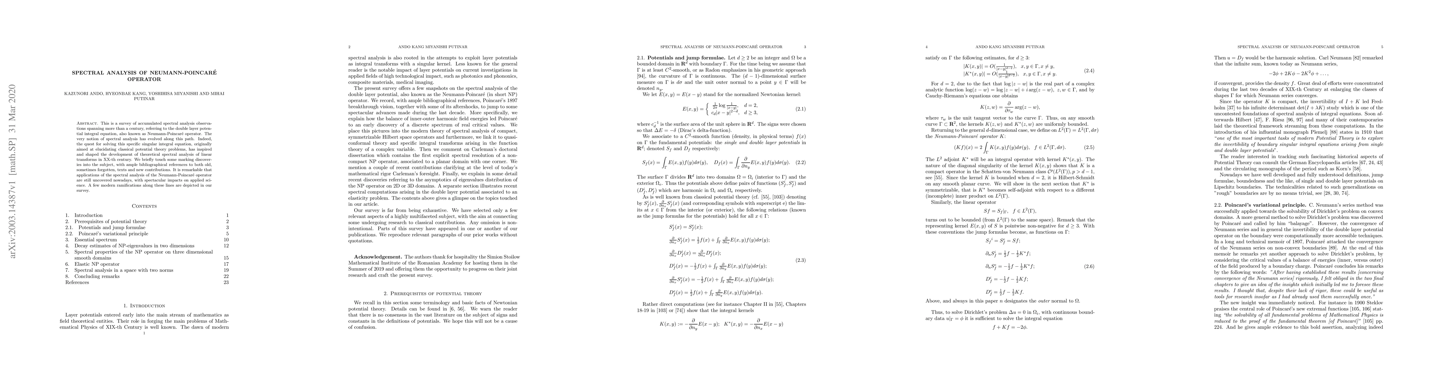 The paper provides a survey of spectral analysis observations of the Neumann-Poincaré operator, spanning over a century, focusing on the double layer potential integral equation. It discusses the evolution of spectral analysis and its applications in solving classical potential theory problems.
