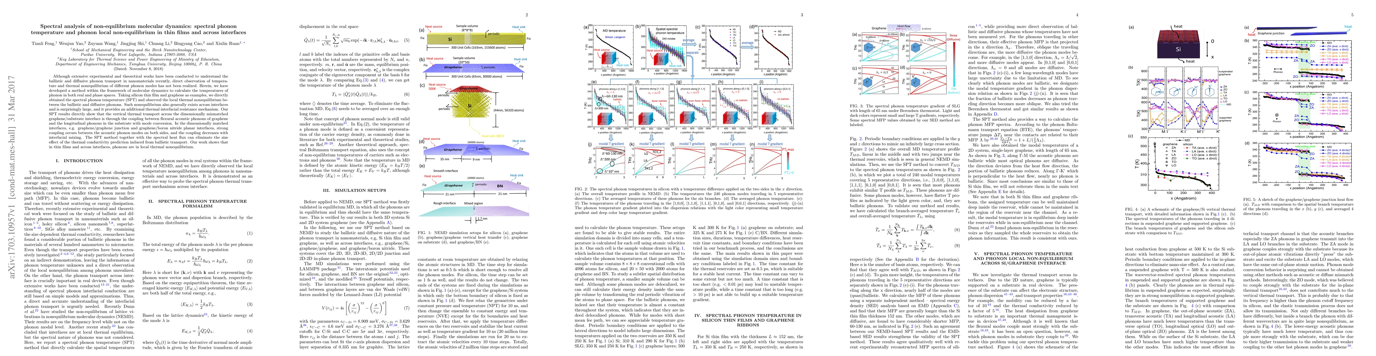 This paper develops a molecular dynamics method to calculate spectral phonon temperatures (SPT) in thin films and at interfaces, revealing local thermal nonequilibrium between ballistic and diffusive phonons. The study highlights significant thermal interfacial resistance mechanisms and mode coupling phenomena at mismatched and matched interfaces.