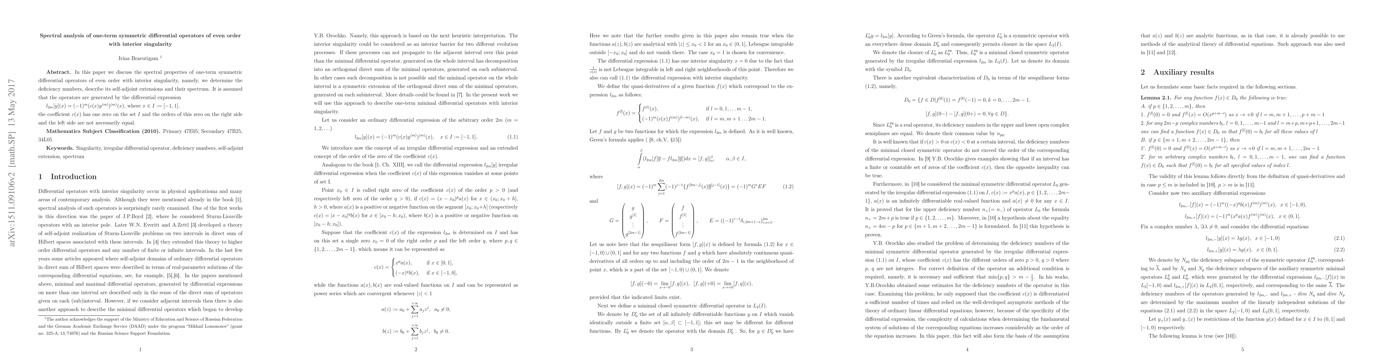 This paper studies the spectral properties of differential operators with a specific form of symmetry and interior singularity, aiming to determine their deficiency numbers and self-adjoint extensions.