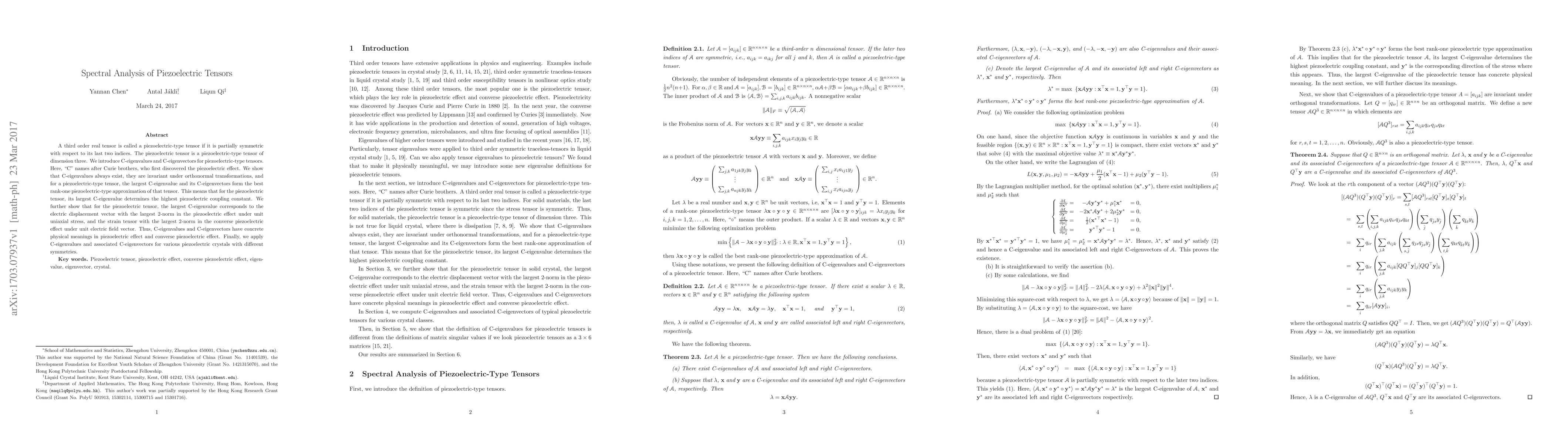 The paper introduces C-eigenvalues and C-eigenvectors for piezoelectric-type tensors, demonstrating their existence and invariance under orthonormal transformations. It establishes connections between the largest C-eigenvalue and physical aspects of piezoelectric effects and converse piezoelectric effects.