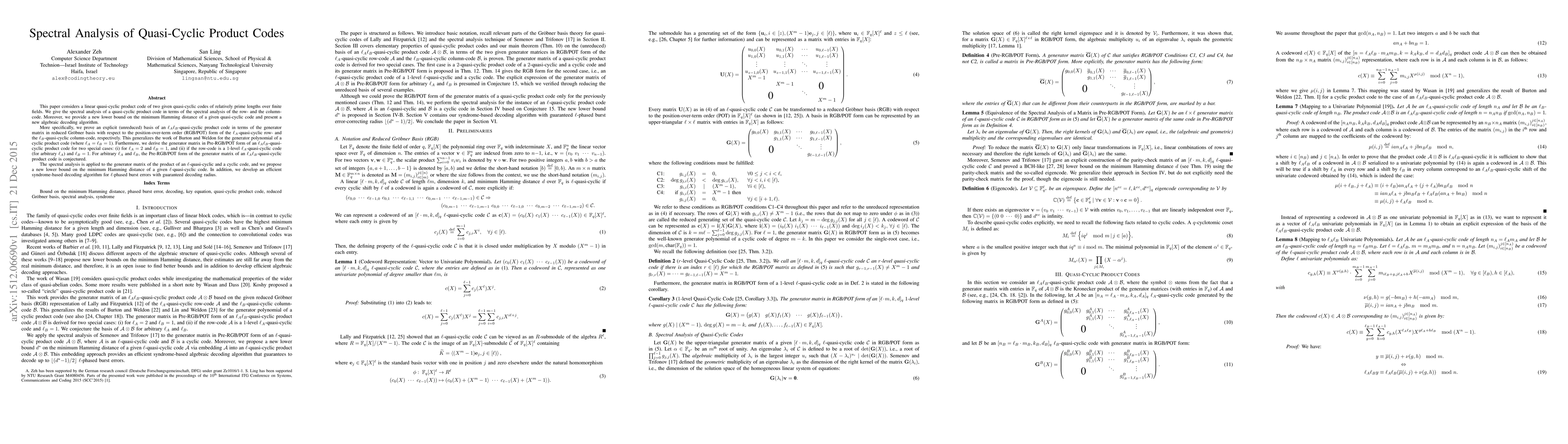 This paper provides a spectral analysis of quasi-cyclic product codes, deriving a new lower bound on the minimum Hamming distance and presenting an algebraic decoding algorithm. It also generalizes the generator matrix basis for quasi-cyclic product codes and proposes a new decoding method for burst errors.