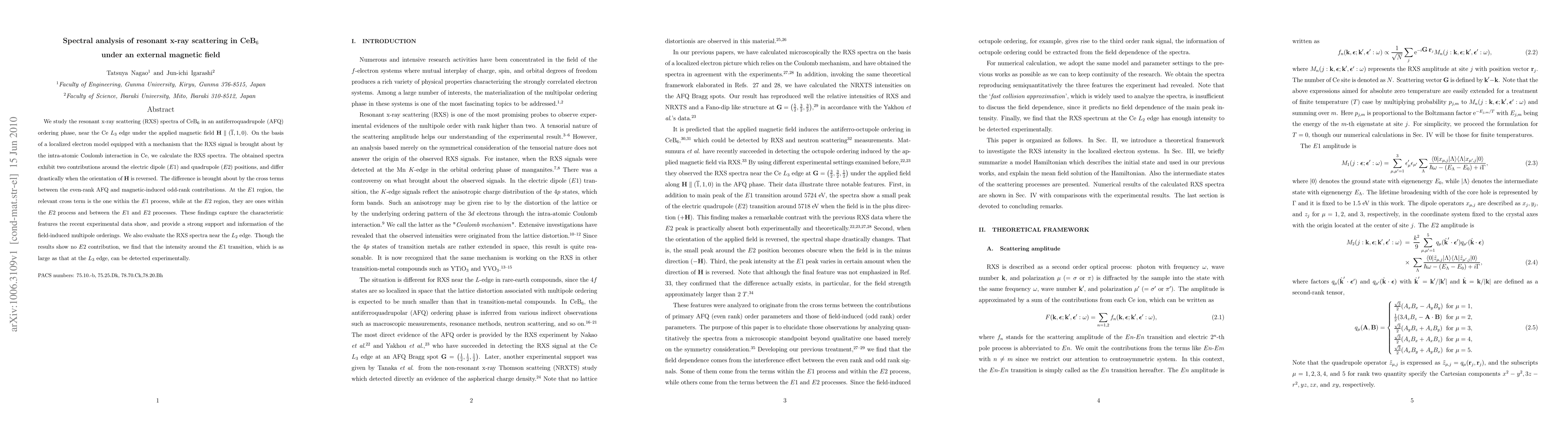 We study the resonant x-ray scattering (RXS) spectra of CeB_{6} in an antiferroquadrupole (AFQ) ordering phase, near the Ce L_3 edge under the applied magnetic field H // (-1,1,0). On the basis of a localized electron model equipped with a mechanism that the RXS signal is brought about by the intra-atomic Coulomb interaction in Ce, we calculate the RXS spectra. The obtained spectra exhibit two contributions around the electric dipole (E1) and quadrupole (E2) positions, and differ drastically when the orientation of H is reversed. The difference is brought about by the cross terms between the even-rank AFQ and magnetic-induced odd-rank contributions. At the E1 region, the relevant cross term is the one within the E1 process, while at the E2 region, they are ones within the E2 process and between the E1 and E2 processes. These findings capture the characteristic features the recent experimental data show, and provide a strong support and information of the field-induced multipole orderings. We also evaluate the RXS spectra near the L_{2} edge. Though the results show no E2 contribution, we find that the intensity around the E1 transition, which is as large as that at the L_{3} edge, can be detected experimentally.