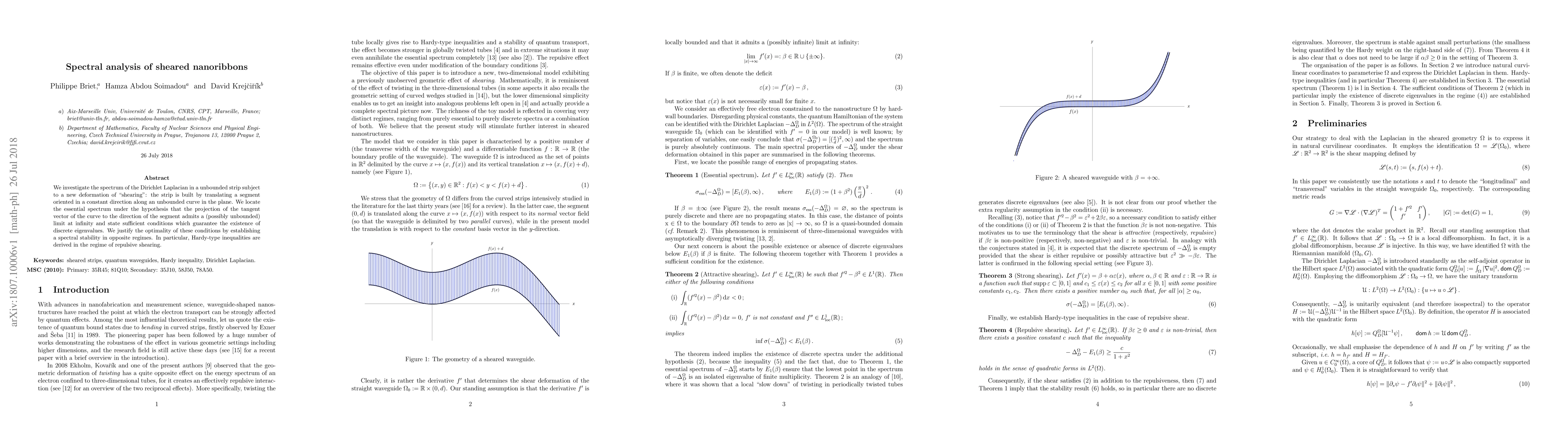 We investigate the spectrum of the Dirichlet Laplacian in a unbounded strip subject to a new deformation of "shearing": the strip is built by translating a segment oriented in a constant direction along an unbounded curve in the plane. We locate the essential spectrum under the hypothesis that the projection of the tangent vector of the curve to the direction of the segment admits a (possibly unbounded) limit at infinity and state sufficient conditions which guarantee the existence of discrete eigenvalues. We justify the optimality of these conditions by establishing a spectral stability in opposite regimes. In particular, Hardy-type inequalities are derived in the regime of repulsive shearing.