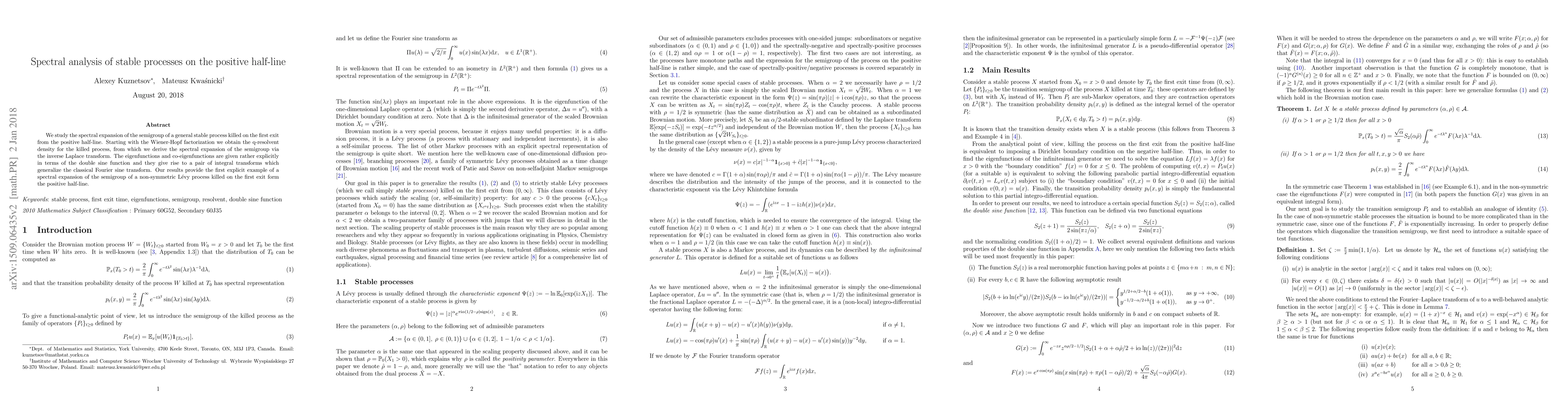 This paper investigates the spectral expansion of a stable process killed upon exiting the positive half-line, deriving the q-resolvent density and eigenfunctions via Wiener-Hopf factorization and inverse Laplace transform. The eigenfunctions are expressed explicitly using the double sine function, leading to integral transforms that generalize the Fourier sine transform.