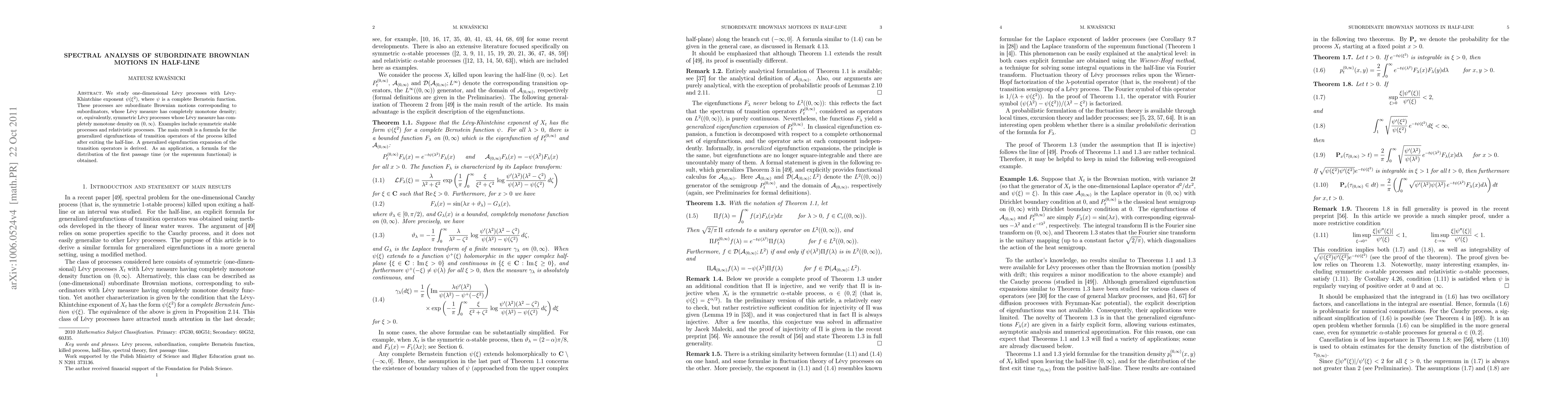 We study one-dimensional Levy processes with Levy-Khintchine exponent psi(xi^2), where psi is a complete Bernstein function. These processes are subordinate Brownian motions corresponding to subordinators, whose Levy measure has completely monotone density; or, equivalently, symmetric Levy processes whose Levy measure has completely monotone density on the positive half-line. Examples include symmetric stable processes and relativistic processes. The main result is a formula for the generalized eigenfunctions of transition operators of the process killed after exiting the half-line. A generalized eigenfunction expansion of the transition operators is derived. As an application, a formula for the distribution of the first passage time (or the supremum functional) is obtained.
