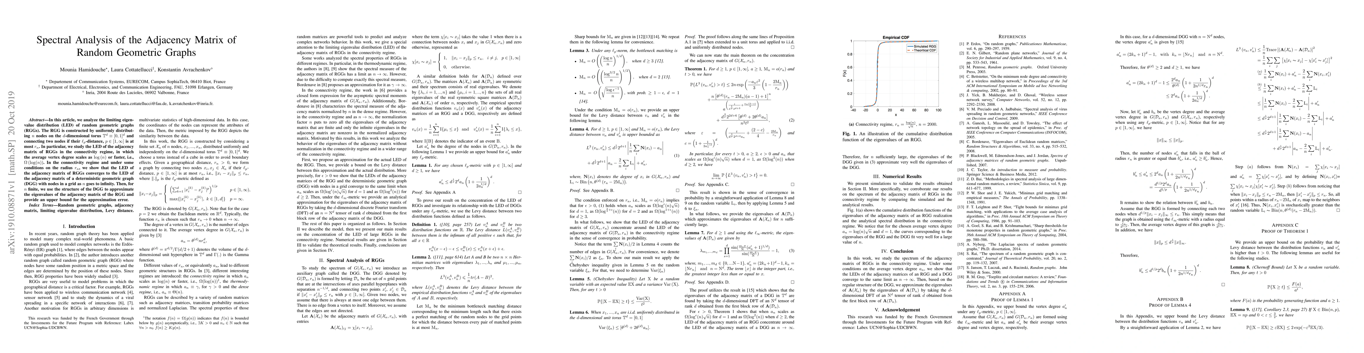 The paper analyzes the limiting eigenvalue distribution of random geometric graphs, finding that under certain conditions, it converges to a deterministic geometric graph with nodes in a grid as the number of nodes increases. This allows for approximation of the eigenvalues of the adjacency matrix.