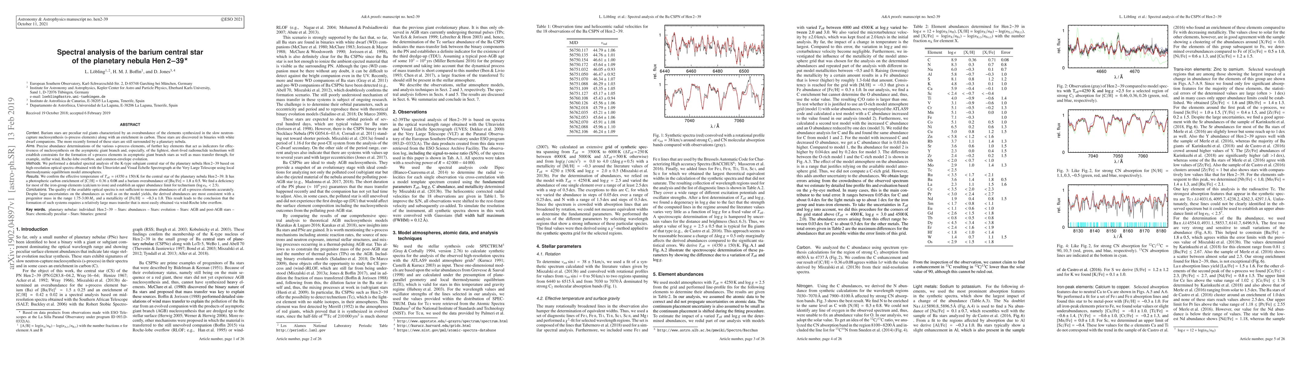 This study conducts a spectral analysis of the barium central star of the planetary nebula Hen 2-39, confirming its effective temperature and identifying significant carbon enrichment and barium overabundance. The analysis suggests a progenitor mass range of 1.75-3.00 $M_\odot$ and supports the hypothesis that mass transfer via wind-Roche lobe overflow is crucial for the formation of such systems.