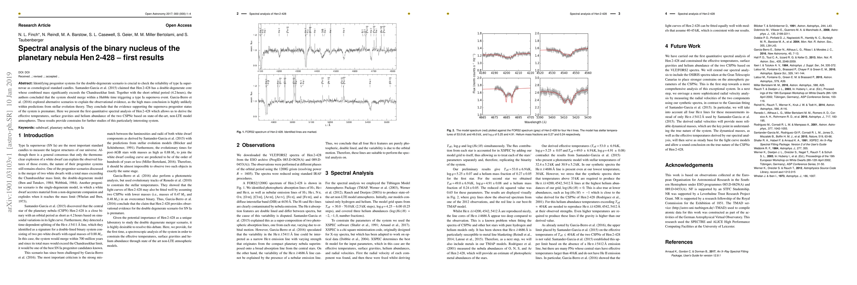 Identifying progenitor systems for the double-degenerate scenario is crucial to check the reliability of type Ia super-novae as cosmological standard candles. Santander-Garcia et al. (2015) claimed that Hen 2-428 has a double-degenerate core whose combined mass significantly exceeds the Chandrasekhar limit. Together with the short orbital period (4.2 hours), the authors concluded that the system should merge within a Hubble time triggering a type Ia supernova event. Garcia-Berro et al. (2016) explored alternative scenarios to explain the observational evidence, as the high mass conclusion is highly unlikely within predictions from stellar evolution theory. They conclude that the evidence supporting the supernova progenitor status of the system is premature. Here we present the first quantitative spectral analysis of Hen 2-428 which allows us to derive the effective temperatures, surface gravities and helium abundance of the two CSPNe based on state-of-the-art, non-LTE model atmospheres. These results provide constrains for further studies of this particularly interesting system.