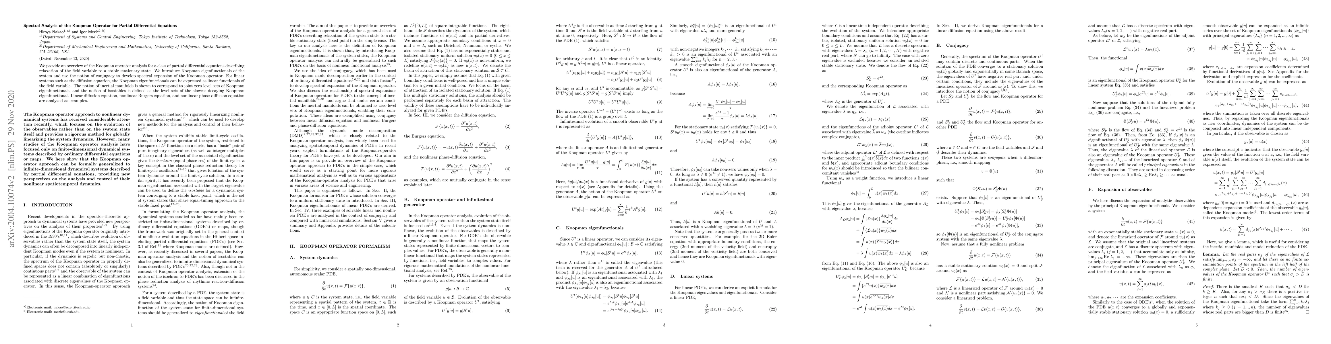 This paper explores the Koopman operator analysis for partial differential equations, focusing on relaxation dynamics. It introduces Koopman eigenfunctionals and uses conjugacy to develop spectral expansions, demonstrating applications to linear and nonlinear systems like the diffusion and Burgers equations.