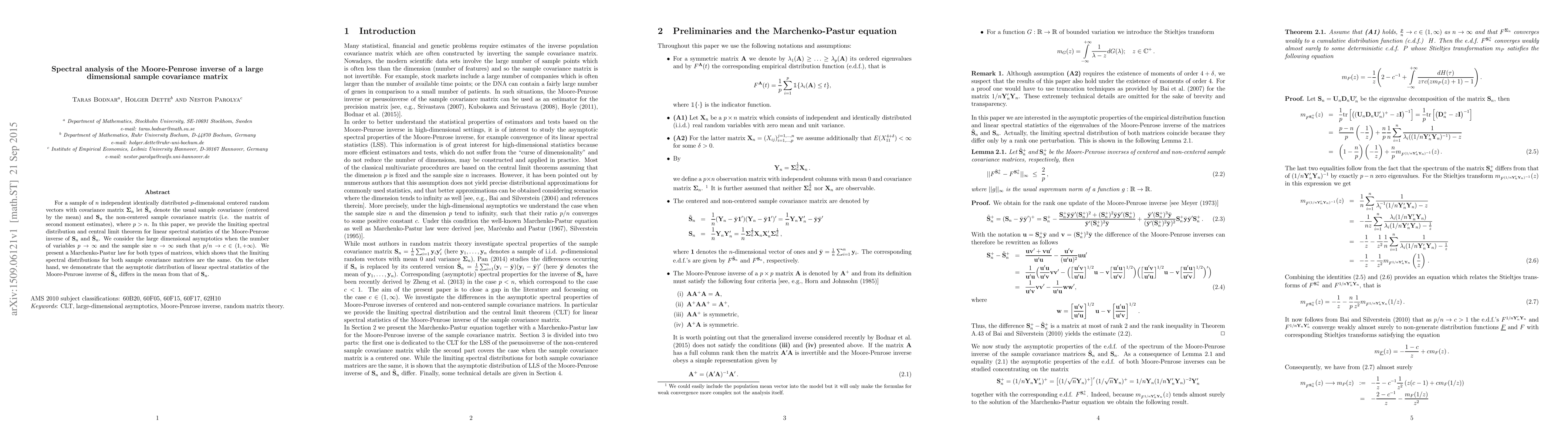 This paper studies the spectral properties of the Moore-Penrose inverse for large dimensional sample covariance matrices. It reveals a Marchenko-Pastur law and shows differing asymptotic distributions for linear spectral statistics of the inverses of centered and non-centered sample covariance matrices in high dimensions.