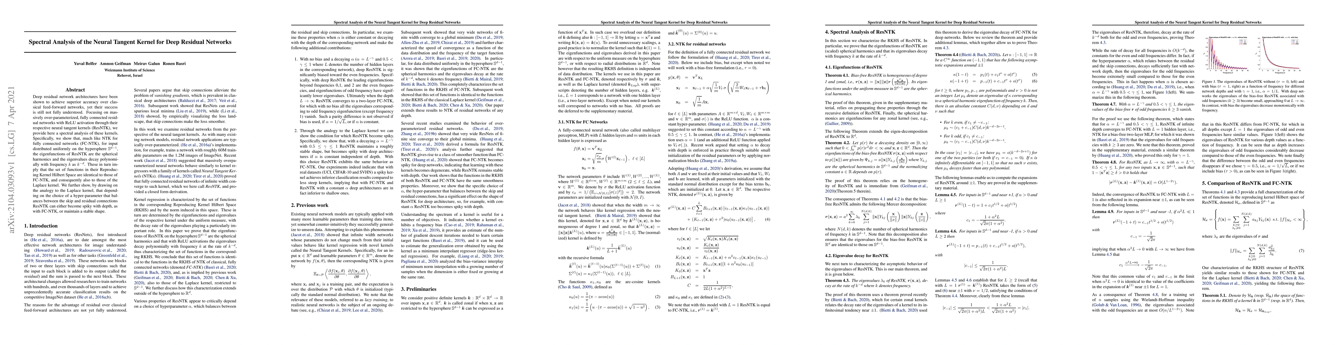 This paper conducts a spectral analysis of the neural tangent kernel (ResNTK) for deep residual networks, revealing that its eigenfunctions and eigenvalues behave similarly to those of fully connected networks, implying identical function spaces. It also shows that the shape of ResNTK can stabilize or become spiky with depth, depending on the balance between skip and residual connections.