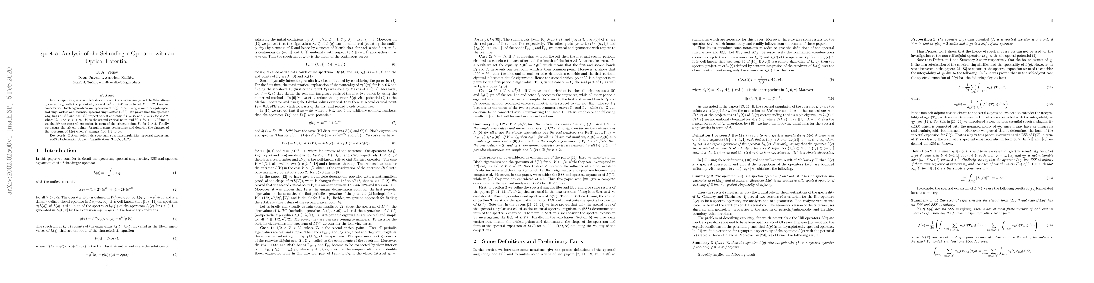 In this paper we give a complete description of the spectral analysis of the Schrodinger operator L(V) with the optical potentil. First we consider the Bolch eigenvalues and spectrum of L(V). Then using it we investigate spectral singularities and essential spectral singularities (ESS). We prove that the operator L(V) has no ESS and has ESS respectively if and only if V is not a critical point and V is a critical point. Using it we classify the spectral expansion in term of the critical points. Finally we discuss the critical points, formulate some conjectures and describe the changes of the spectrum of L(V) when V changes.