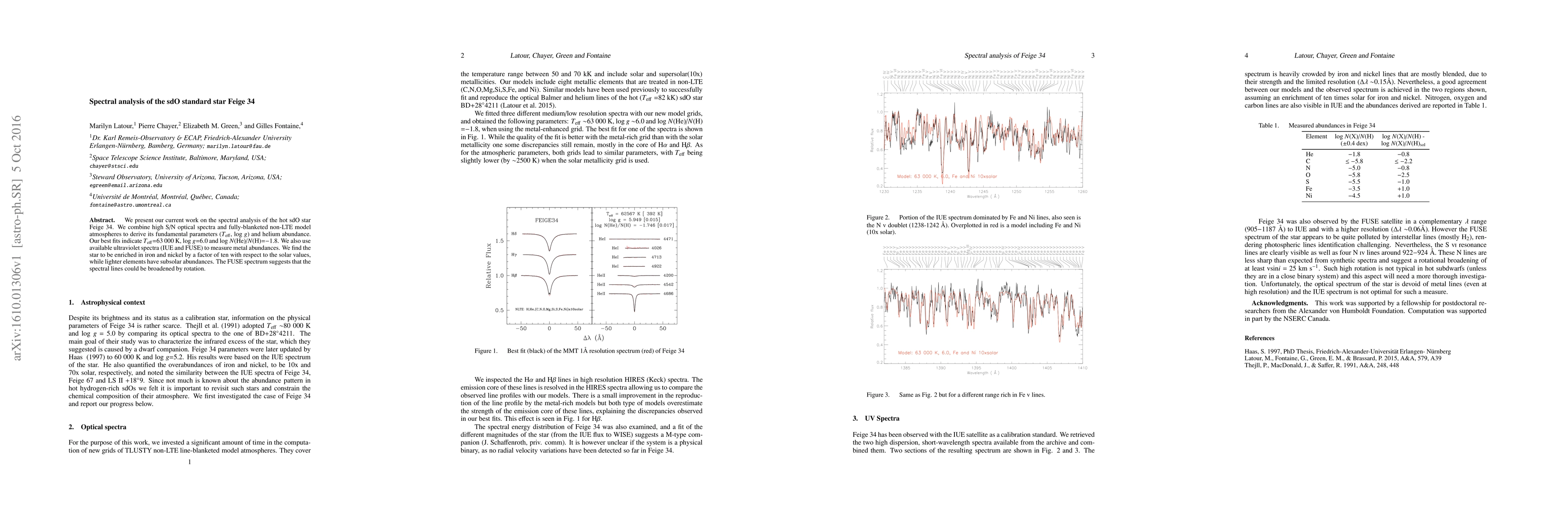We present our current work on the spectral analysis of the hot sdO star Feige 34. We combine high S/N optical spectra and fully-blanketed non-LTE model atmospheres to derive its fundamental parameters (Teff, log g) and helium abundance. Our best fits indicate Teff =63 000 K, log g=6.0 and log N(He)/N(H)=-1.8. We also use available ultraviolet spectra (IUE and FUSE) to measure metal abundances. We find the star to be enriched in iron and nickel by a factor of ten with respect to the solar values, while lighter elements have subsolar abundances. The FUSE spectrum suggests that the spectral lines could be broadened by rotation.