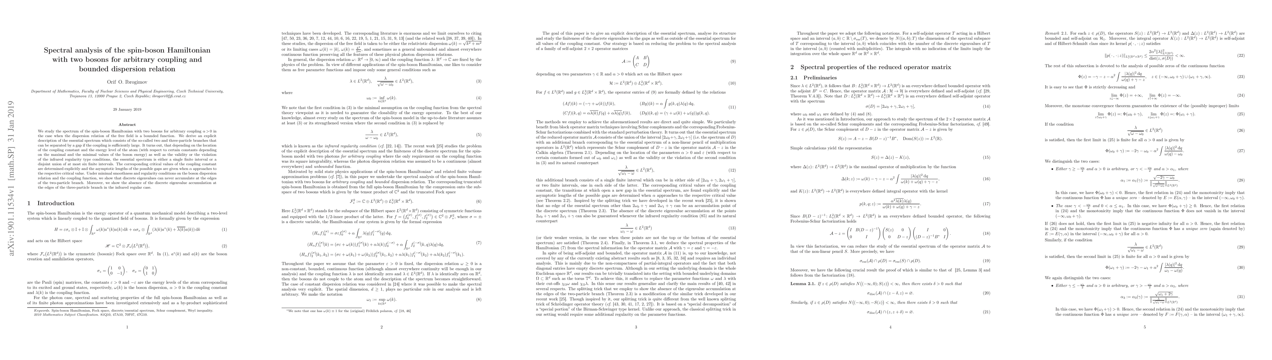 This paper investigates the spectral properties of a spin-boson Hamiltonian with two bosons under arbitrary coupling and bounded dispersion relations. It derives an explicit description of the essential spectrum, revealing that it can consist of up to six finite intervals depending on coupling strength and energy levels, with no accumulation of discrete eigenvalues at the edges of the two- and three-particle branches.