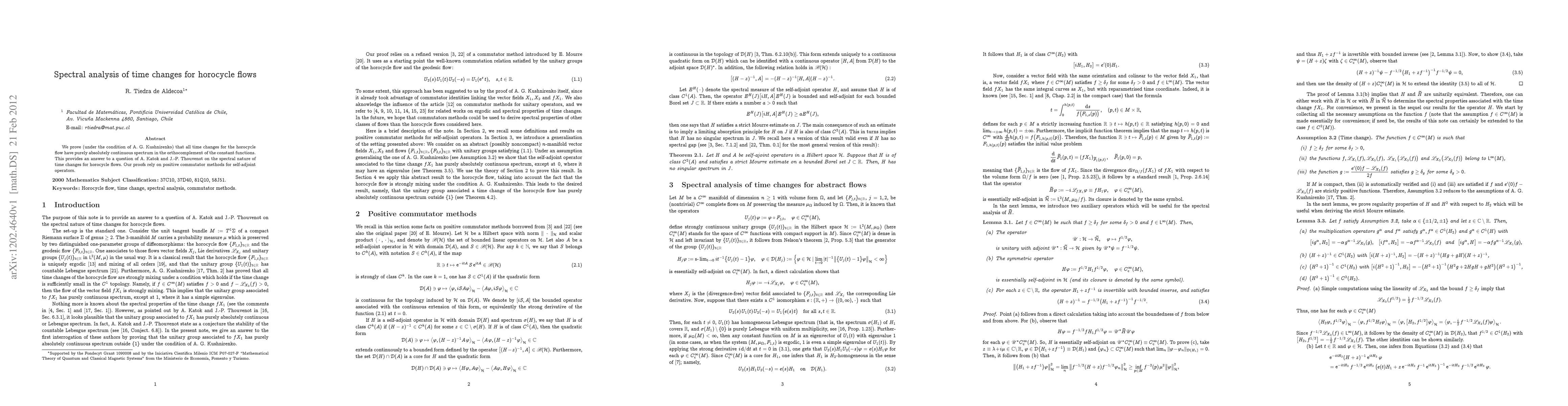 This paper proves that under the condition of A. G. Kushnirenko, all time changes for horocycle flows exhibit purely absolutely continuous spectrum in the orthocomplement of constant functions, answering a question posed by A. Katok and J.-P. Thouvenot. The proofs utilize positive commutator methods for self-adjoint operators.