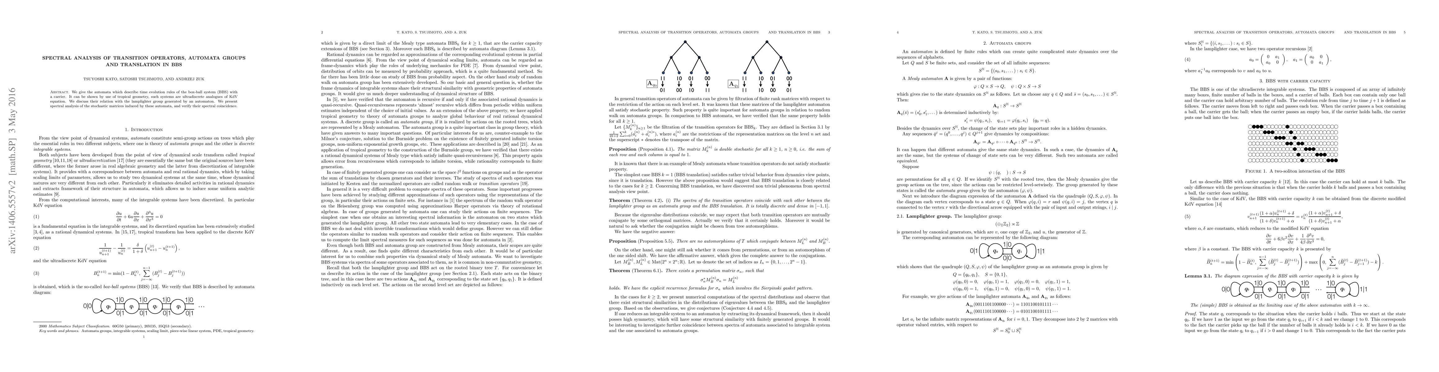 We give the automata which describe time evolution rules of the box-ball system (BBS) with a carrier. It can be shown by use of tropical geometry, such systems are ultradiscrete analogues of KdV equation. We discuss their relation with the lamplighter group generated by an automaton. We present spectral analysis of the stochastic matrices induced by these automata, and verify their spectral coincidence.