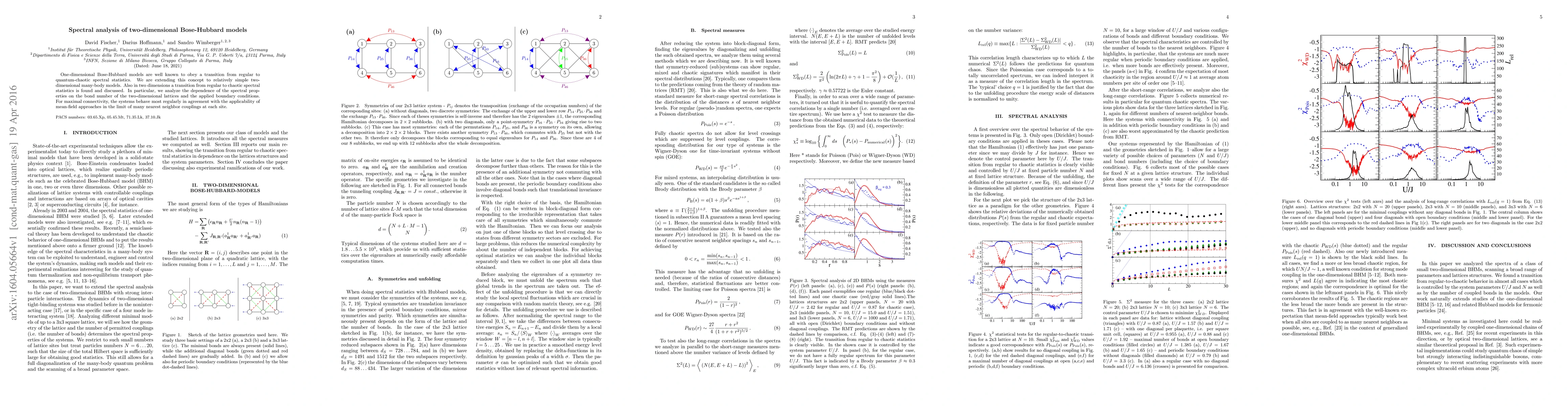 One-dimensional Bose-Hubbard models are well known to obey a transition from regular to quantum-chaotic spectral statistics. We are extending this concept to relatively simple two-dimensional many-body models. Also in two dimensions a transition from regular to chaotic spectral statistics is found and discussed. In particular, we analyze the dependence of the spectral properties on the bond number of the two-dimensional lattices and the applied boundary conditions. For maximal connectivity, the systems behave most regularly in agreement with the applicability of mean-field approaches in the limit of many nearest-neighbor couplings at each site.
