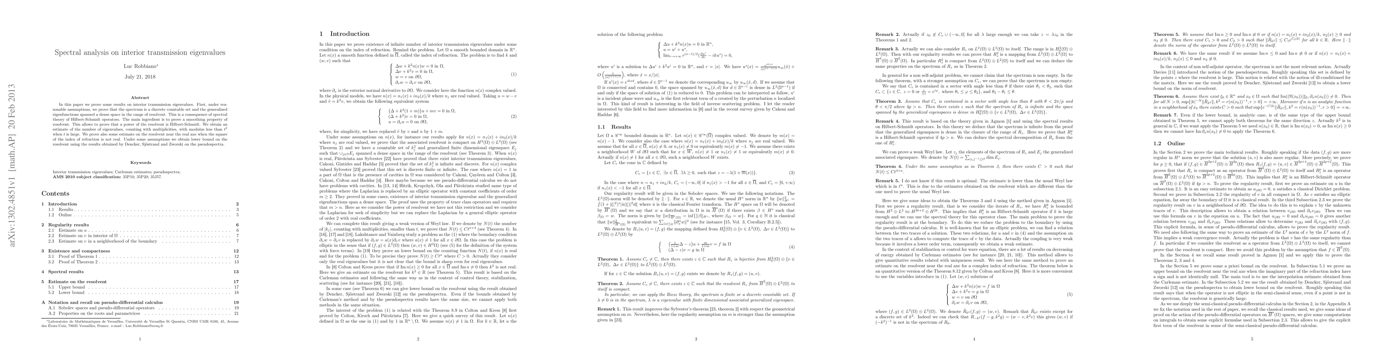 In this paper we prove some results on interior transmission eigenvalues. First, under rea- sonable assumptions, we prove that the spectrum is a discrete countable set and the generalized eigenfunctions spanned a dense space in the range of resolvent. This is a consequence of spectral theory of Hilbert-Schmidt operators. The main ingredient is to prove a smoothing property of resolvent. This allows to prove that a power of the resolvent is Hilbert-Schmidt. We obtain an estimate of the number of eigenvalues, counting with multiplicities, with modulus less than t2 when t is large. We prove also some estimate on the resolvent near the real axe when the square of the index of refraction is not real. Under some assumptions we obtain lower bound on the resolvent using the results obtained by Dencker, Sj\"ostrand and Zworski on the pseudospectra.