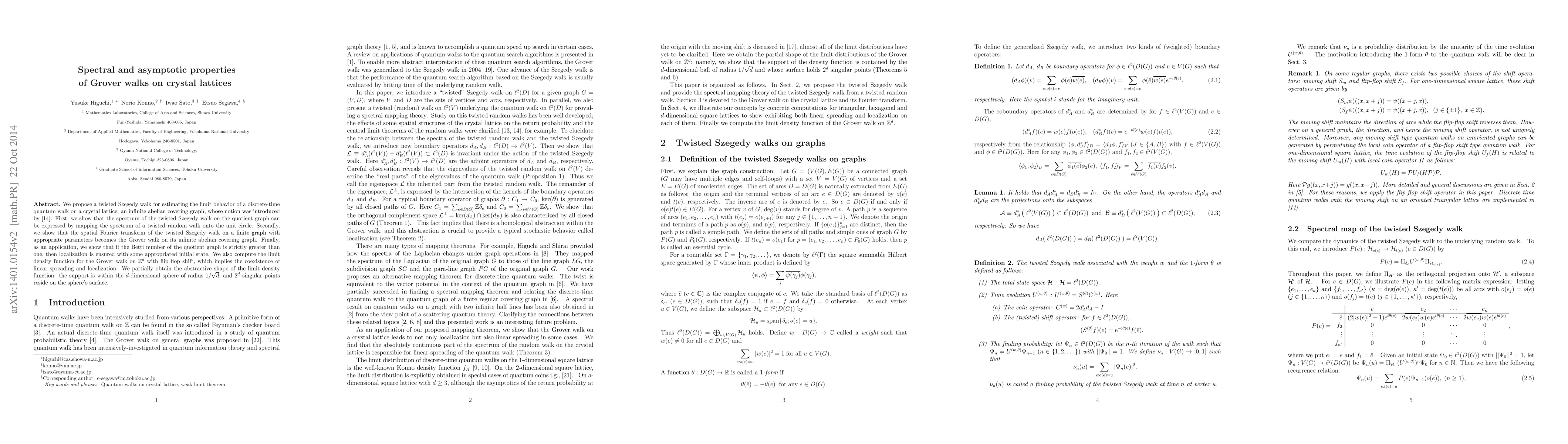 This paper investigates the spectral and asymptotic properties of Grover walks on crystal lattices, proposing a twisted Szegedy walk to analyze their limit behavior. It demonstrates the spectrum mapping and localization properties, and computes the limit density function for the Grover walk, revealing coexistence of linear spreading and localization with singular points on the sphere's surface.