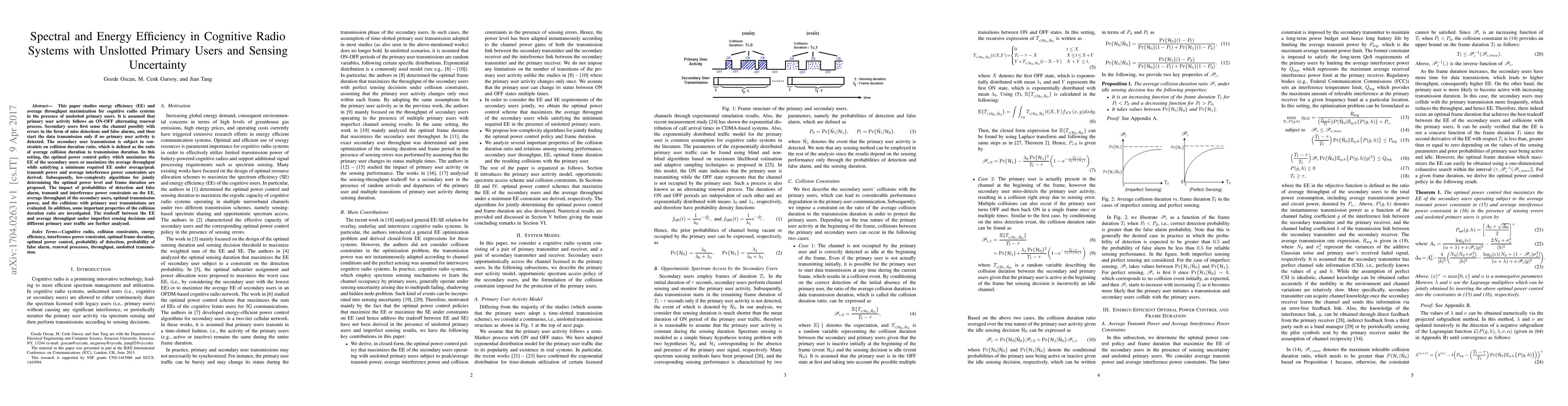 This paper optimizes energy efficiency and average throughput in cognitive radio systems with unslotted primary users, considering sensing uncertainty and collision constraints. It derives optimal power control policies and proposes low-complexity algorithms to maximize performance under various scenarios.