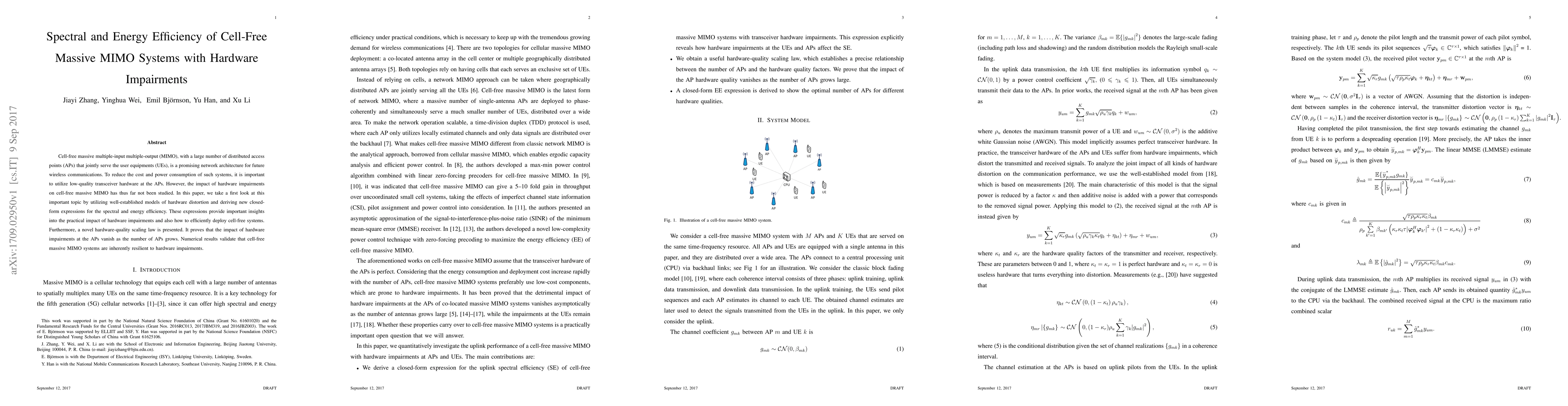 This paper investigates the spectral and energy efficiency of cell-free massive MIMO systems under hardware impairments, deriving new closed-form expressions and demonstrating that the impact of such impairments diminishes with an increasing number of access points. Numerical results confirm the resilience of these systems to hardware distortions.