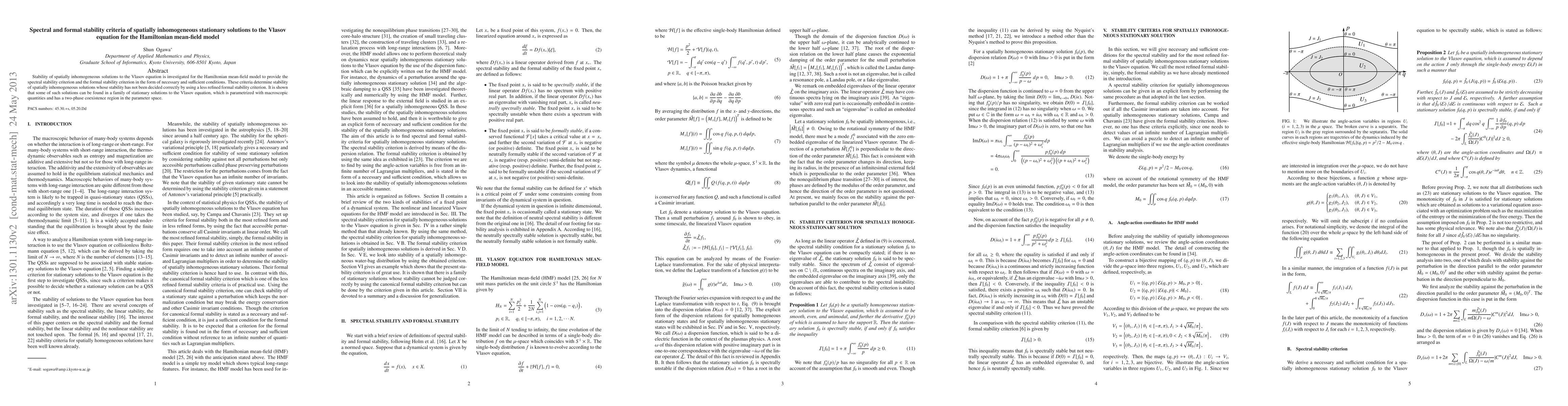 This paper investigates stability of spatially inhomogeneous solutions to the Vlasov equation for the Hamiltonian mean-field model, providing spectral and formal stability criteria that can identify previously incorrectly judged stable solutions, particularly in a two-phase coexistence region of parameter space.